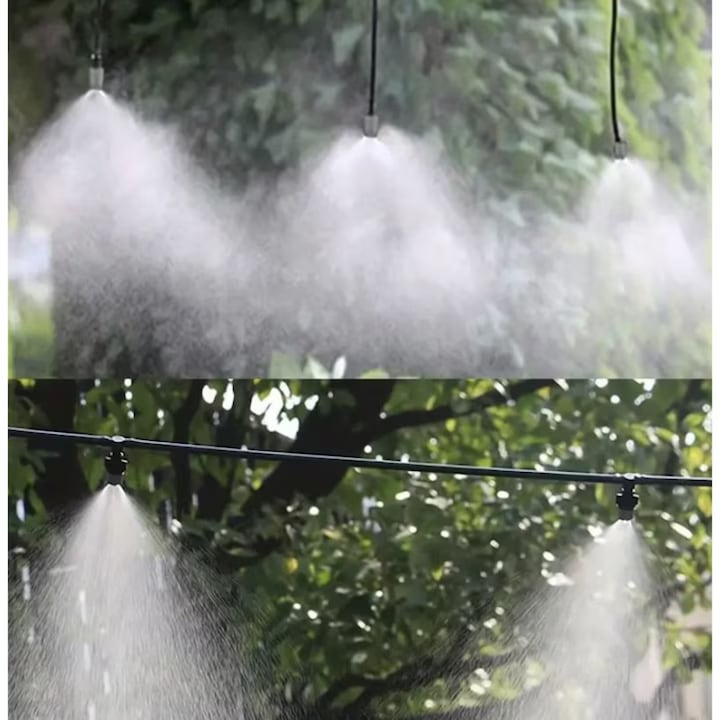 Cele 10 duze reglabile, amplasate la fiecare metru, permit o acoperire uniforma si eficienta, fie pentru racorirea aerului, fie pentru udarea plantelor, stropirea gazonului sau refresarea animalelor in curte. Pulverizarea fina ajuta si la reducerea prafului si alungarea insectelor zburatoare, contribuind la un spatiu mai curat si mai confortabil.
