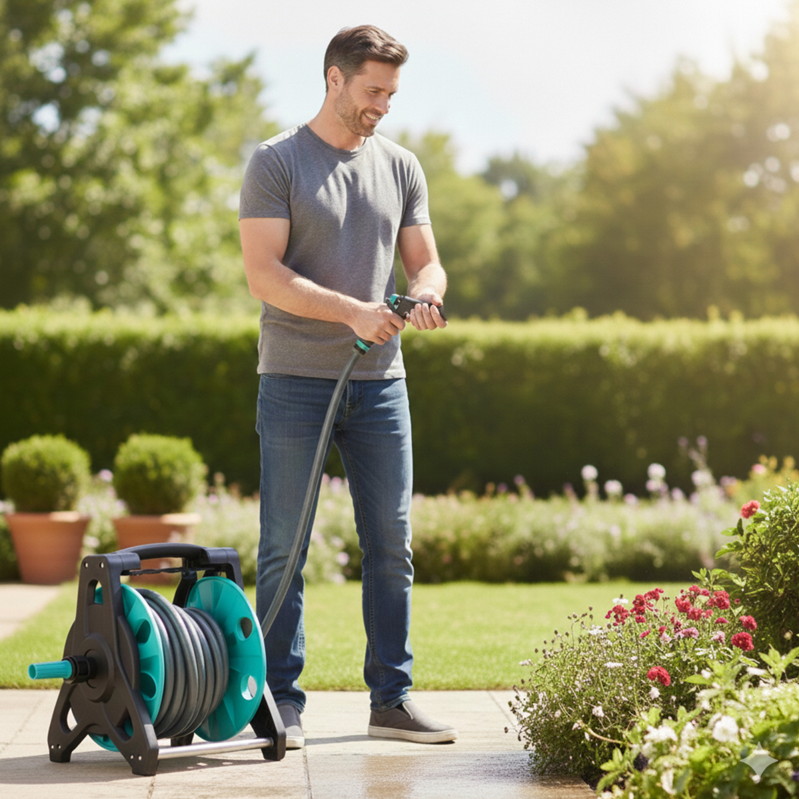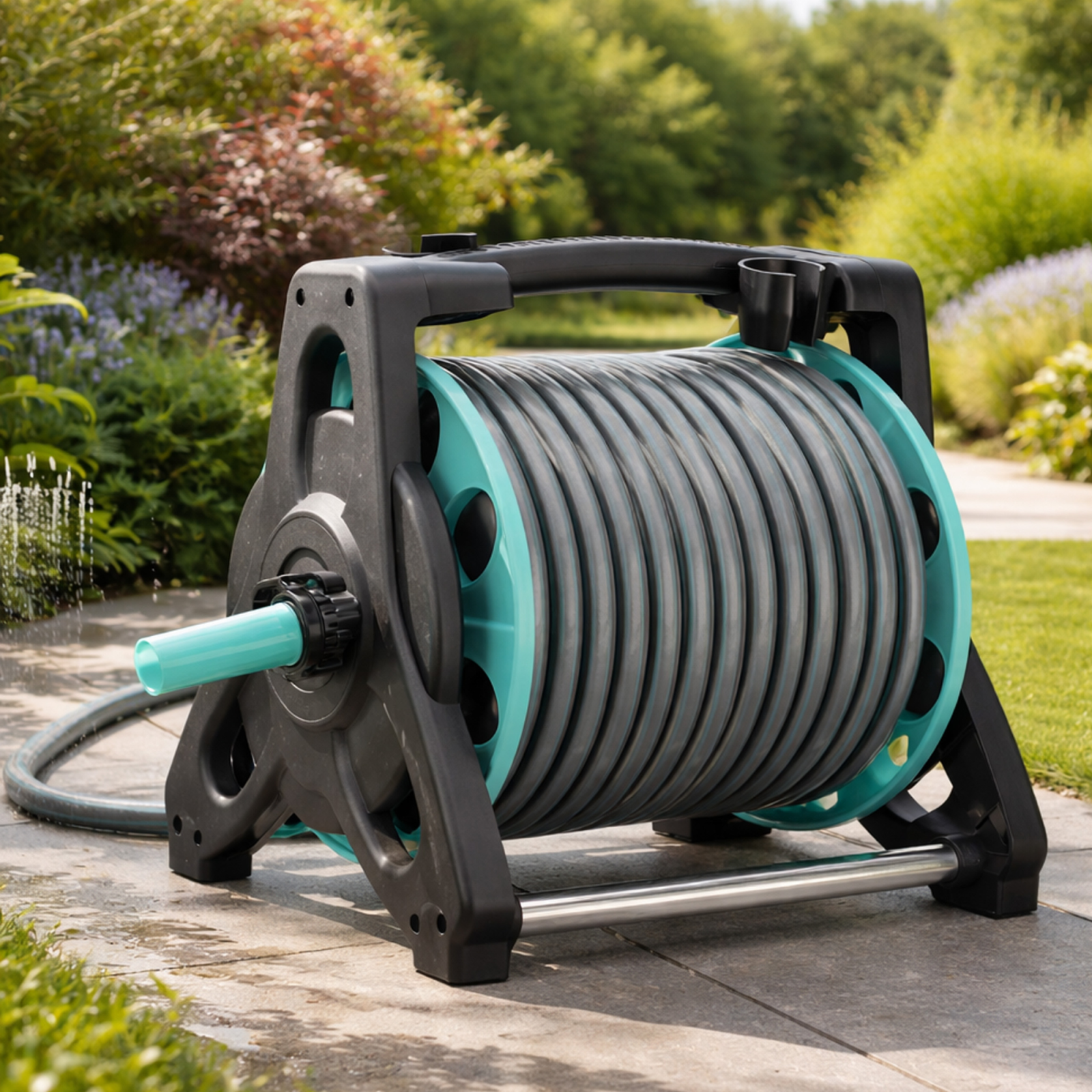 Tamburul permite strangerea usoara si rapida a furtunului, prevenind incurcarea si deteriorarea. Astfel, gradina ta ramane organizata si estetica in permanenta.