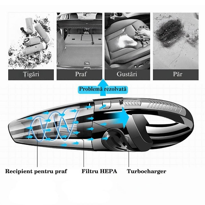 Aspiratorul este echipat cu o baterie reincarcabila puternica, care se incarca cu un cablu USB.