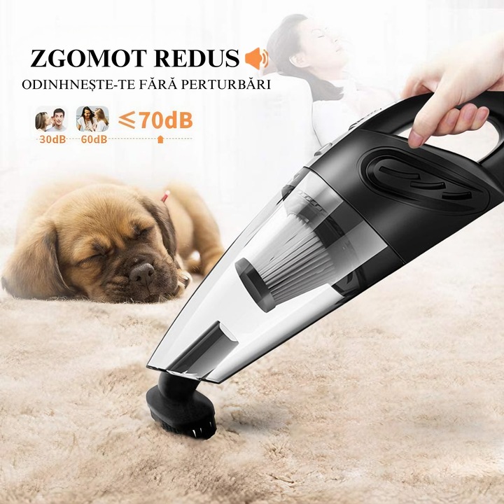 Aspirator de mana portabil cu acumultor VarioShop®, pentru uz caznic sau auto, incarcare USB, 32.000 rot/min, putere 120W, 5 duze ideale pentru spatii inguste, 34cm x 10cm x 5.5cm, Negru