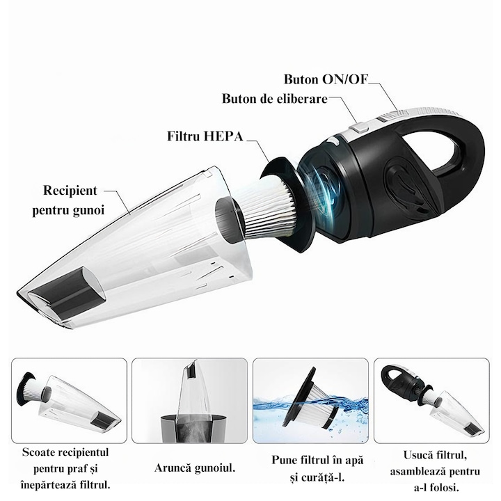 Filtrul aspiratorului poate fi scos si spalat cu apa, asigurand o durata de viata mai lunga si o performanta constanta.