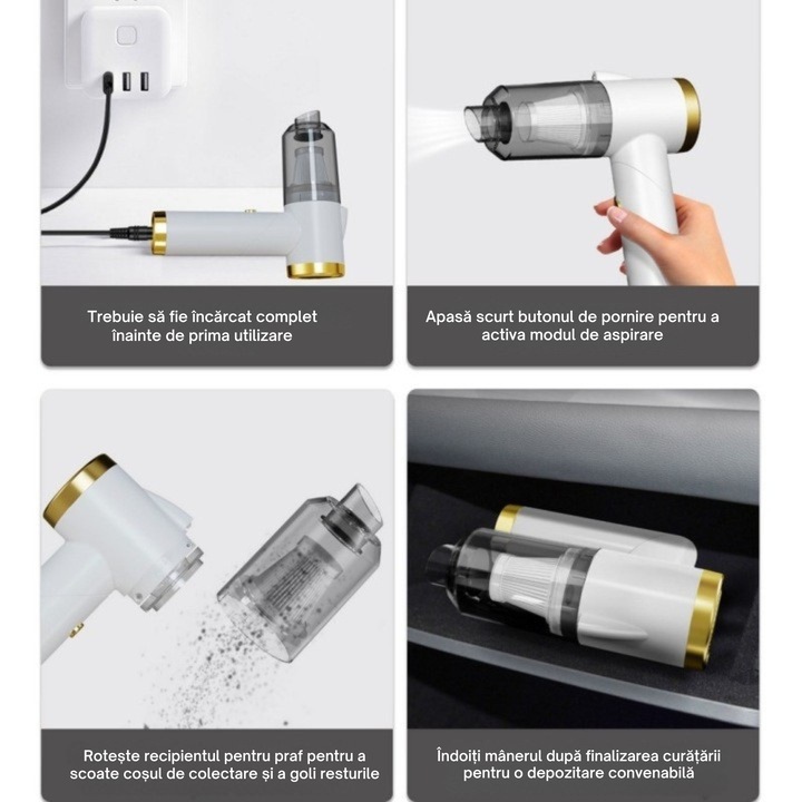 Descopera noul aspirator portabil fara fir, conceput pentru a-ti oferi o curatenie impecabila atat in masina, cat si in casa. Acest aspirator performant combina tehnologia moderna cu un design ergonomic si compact, fiind alegerea ideala pentru cei care vor sa pastreze toate suprafetele curate, fara efort si fara cabluri incomode.