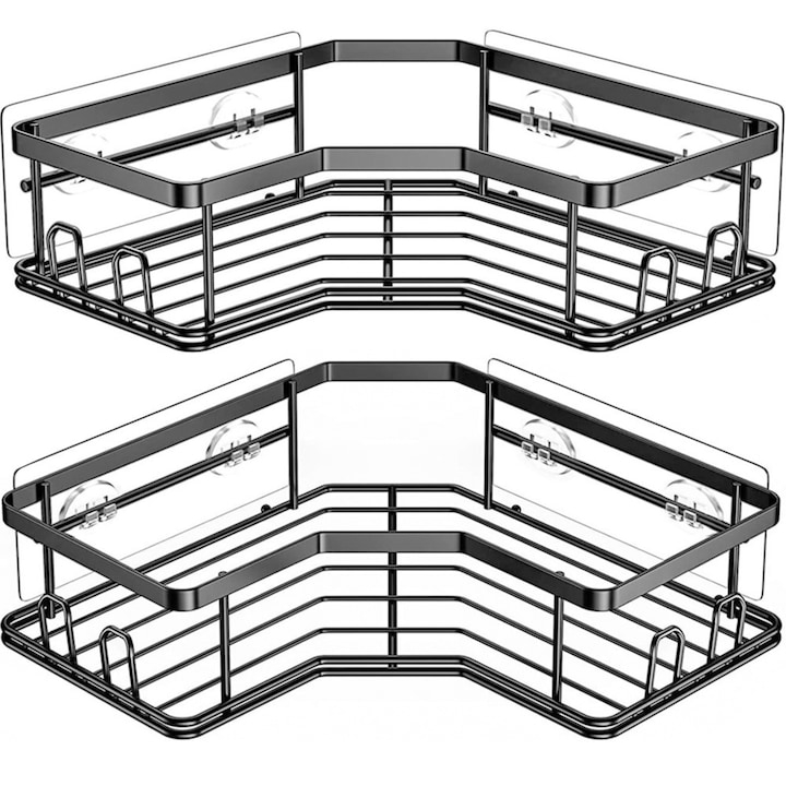 Set 2 rafturi colt pentru baie, VarioShop®, Compacte, Rezistente la Apa, Montaj Ventuze, Inox, 22.5 x 10 / 24.5 x 12 cm, Negru