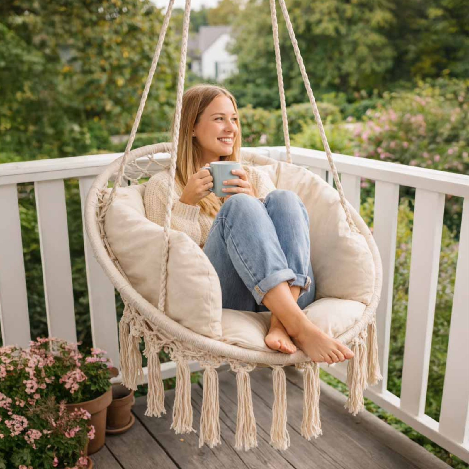 Culoarea ecru si stilul minimalist transforma acest leagan intr-un element decorativ elegant, usor de integrat in orice tip de amenajare. Se potriveste perfect in interioare moderne, dar si in spatii exterioare precum gradini, terase sau balcoane.