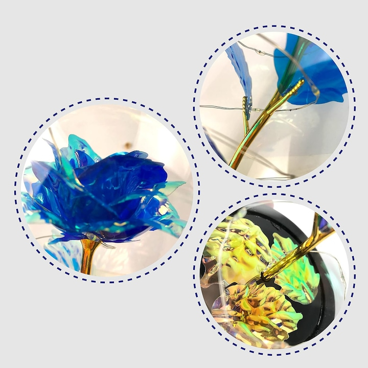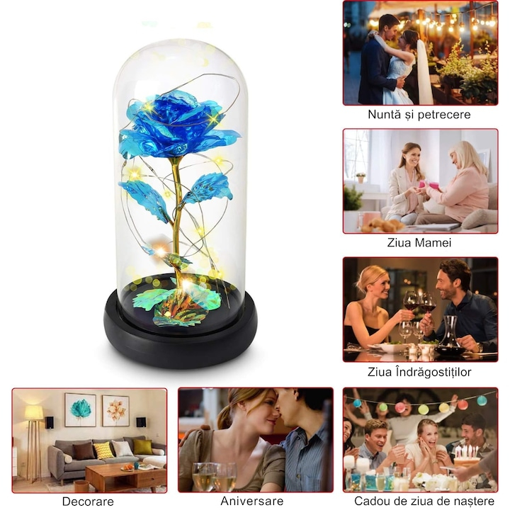 Ofera un cadou de neuitat cu acest trandafir etern intr-o nuanta albastra spectaculoasa, asezat intr-un abajur de sticla elegant si iluminat discret cu LED-uri RGB colorate. Perfect pentru a crea o atmosfera romantica si magica, acest trandafir ramane frumos pentru totdeauna, fara a necesita ingrijire.