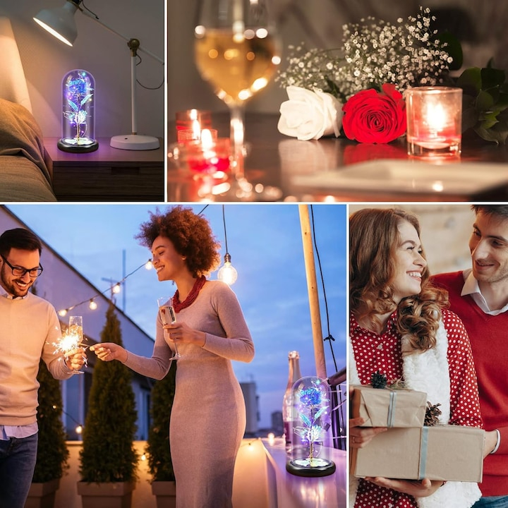 Iluminarea interioara pune in valoare fiecare detaliu al trandafirului, transformandu-l intr-o adevarata piesa de decor, ideala pentru Ziua Indragostitilor, aniversari, zile de nastere sau pur si simplu pentru a spune „Te iubesc” intr-un mod deosebit.