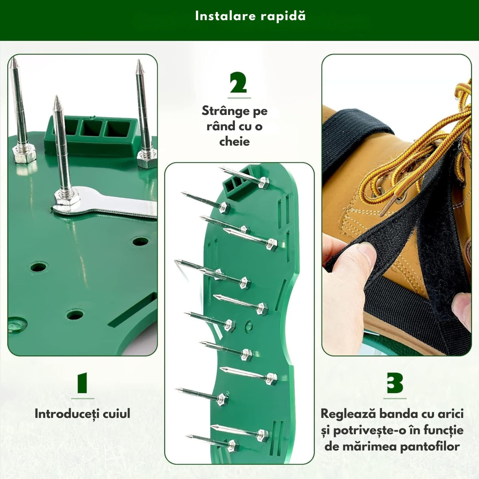 Cu ajutorul acestor huse speciale pentru incaltaminte, echipate cu 26 de tepi solizi din otel, poti aerisi si afana solul fara efort, fara zgomot si fara a investi in echipamente voluminoase sau costisitoare.