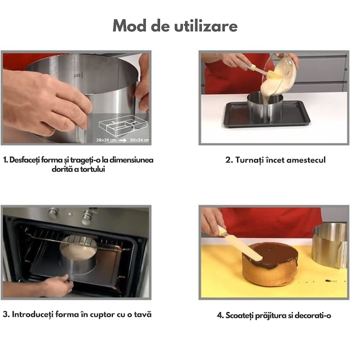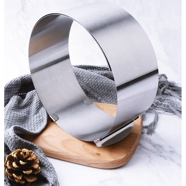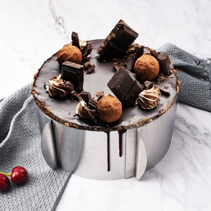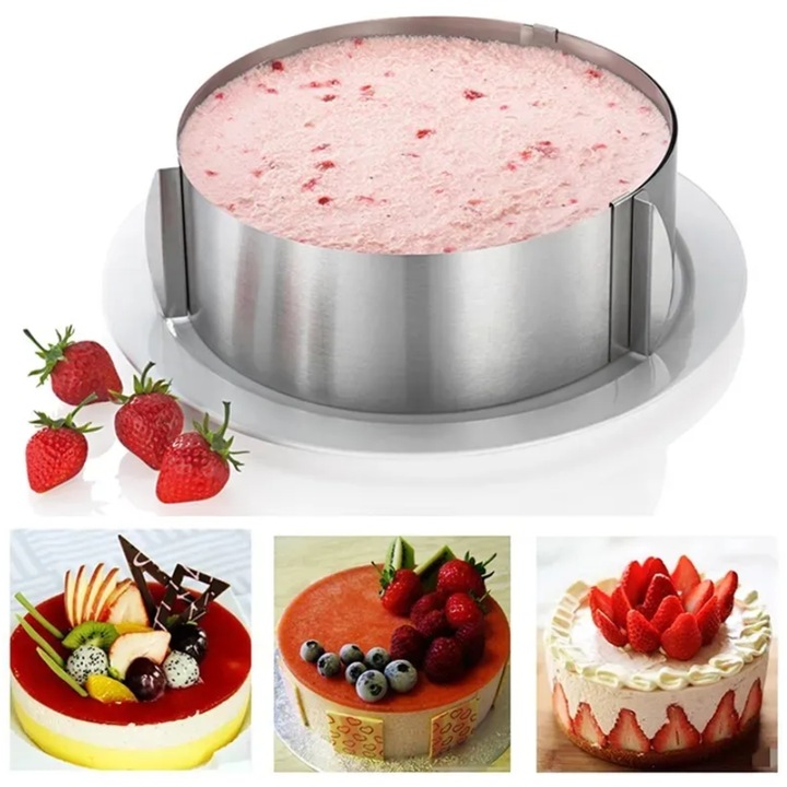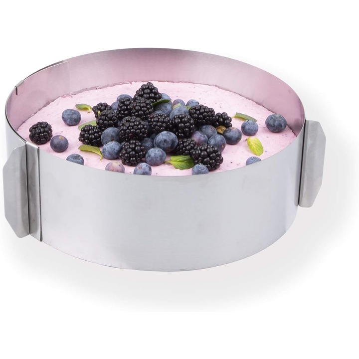 Aceasta forma reglabila pentru tort reprezinta un instrument esential pentru orice bucatar pasionat, oferind atat flexibilitate, cat si calitate profesionala in fiecare preparat.