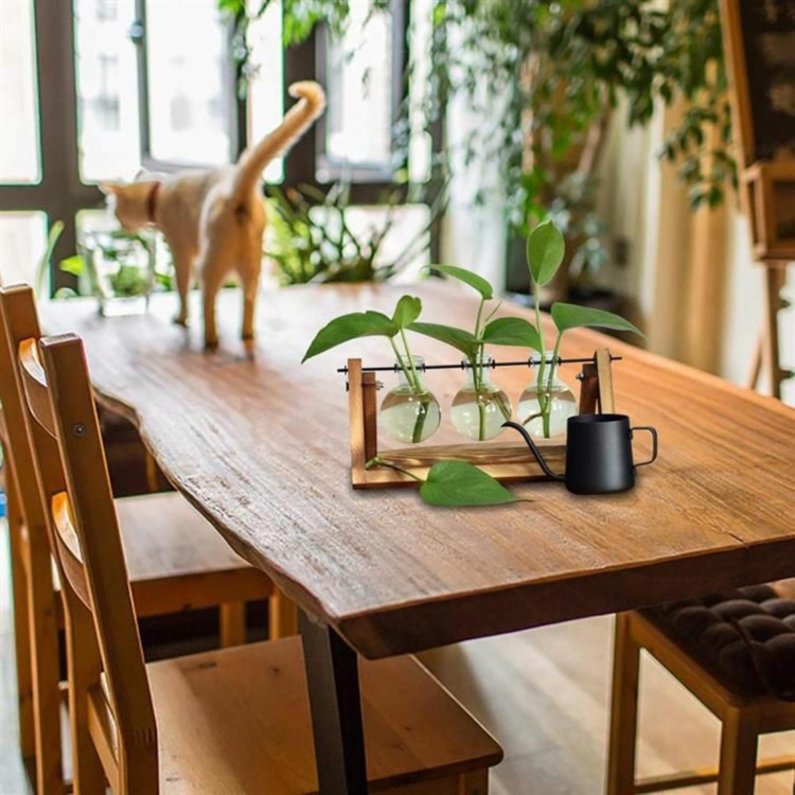Unul dintre cele mai mari avantaje ale acestei vaze hidroponice este aspectul său elegant. Cele trei ghivece cilindrice din sticlă transparentă sunt susținute de un suport pliabil din lemn natural, formând un ansamblu vizual armonios și modern.