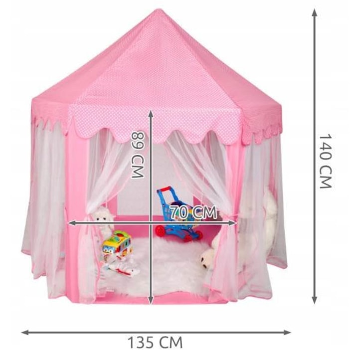 Cortul de tesatura este cu siguranta un companion de neinlocuit in timpul jocurilor copiilor. Are o baza hexagonala, 6 deschideri de intrare si un vizor in forma de piramida. Jucaria se remarca printr-o aparenta atragatoare. Culoarea roz a placii si punctele mici albe ii confera o valoare estetica ridicata. Intrarile sunt acoperite cu perdele translucide albe, care se potrivesc perfect cu restul cortului. Perdelele pot fi legate sau drapate in diferite moduri cu panglici decorative. Solutia cu fundite adauga farmec si diversifica distractia.
