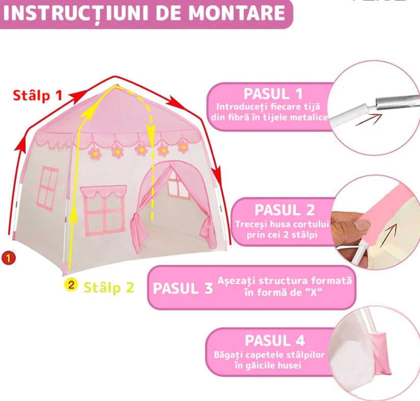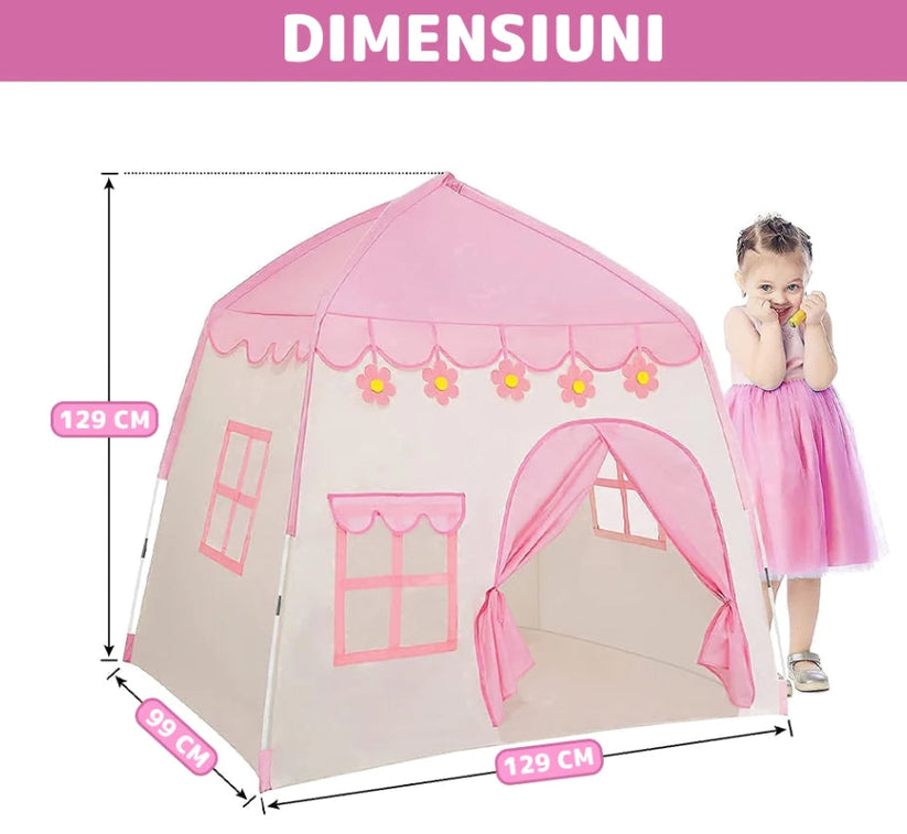 Un cort pentru copii este o distractie minunata pentru ore intregi. Un cort de panza in forma de casa este un cadou de vis pentru fiecare copil. Casa pentru copii are 3 ferestre fine din plasa si o intrare convenabila. Poti sa te ascunzi in el cu jucariile tale preferate si sa-ti lasi imaginatia sa zburde. Palatul pentru copii va fi un loc ideal pentru distractie emotionanta si creativa, atat acasa, cat si in aer liber - de exemplu, in gradina, la picnic, pe terasa sau pe plaja.