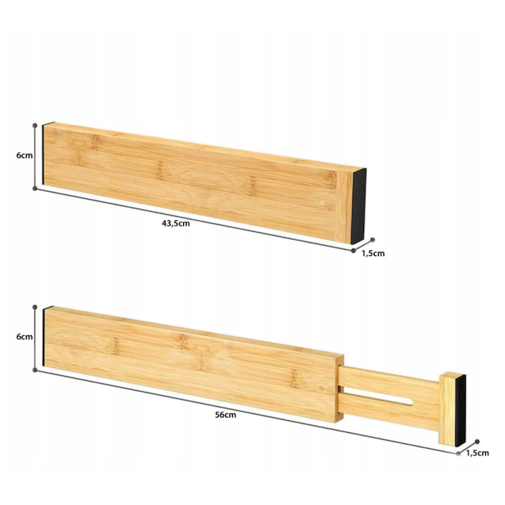 VarioShop® Set 4 separatoare sertar din bambus VarioShop®, organizatoare reglabile, ecologice si durabile, potrivite pentru bucatarie, birou, baie sau dressing, mecanism cu arc, montaj fara unelte, 56x6x1.5 cm