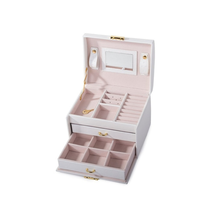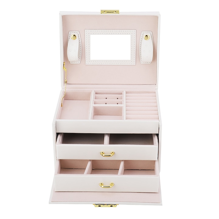 Partea superioara se deschide pentru a dezvalui o oglinda practica, ideala pentru aplicarea bijuteriilor, precum si agatatoare pentru cercei, suporturi speciale pentru inele si alte compartimente pentru piese mai delicate. Primul sertar ofera doua compartimente spatioase, perfecte pentru bijuterii mai voluminoase, cum ar fi ceasurile sau bratarile. Sertarul inferior este impartit in sase compartimente generoase, oferind spatiu suplimentar pentru sortarea bijuteriilor dupa tip sau ocazie.