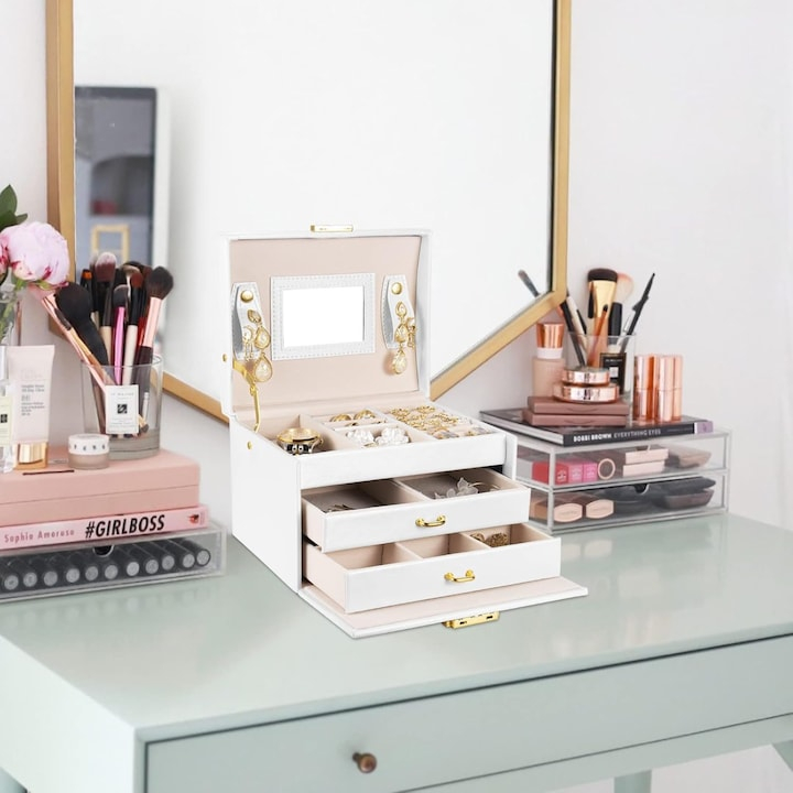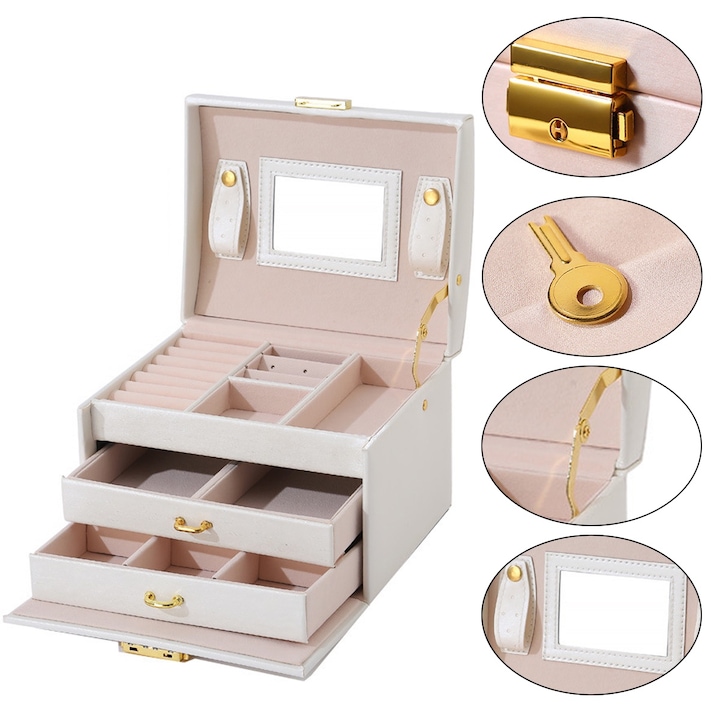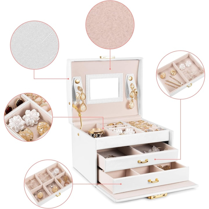 Cutie de bijuterii VarioShop®, eleganta si incapatoare cu sertare, compartimente multiple, oglinda si inchidere cu cheie, ideala pentru inele, cercei, bratari, ceasuri si lanturi, Alb