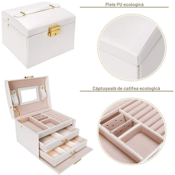 Aceasta cutie de bijuterii este alegerea ideala pentru orice iubitoare de accesorii care isi doreste organizare, eleganta si protectie intr-un singur produs.