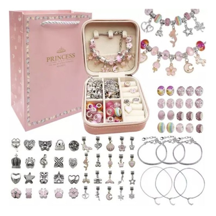 Setul include 69 de elemente, printre care pandantive in diverse forme si culori, perfecte pentru a crea bratari si coliere unice. Fiecare piesa este atent finisata pentru un look elegant si vesel.