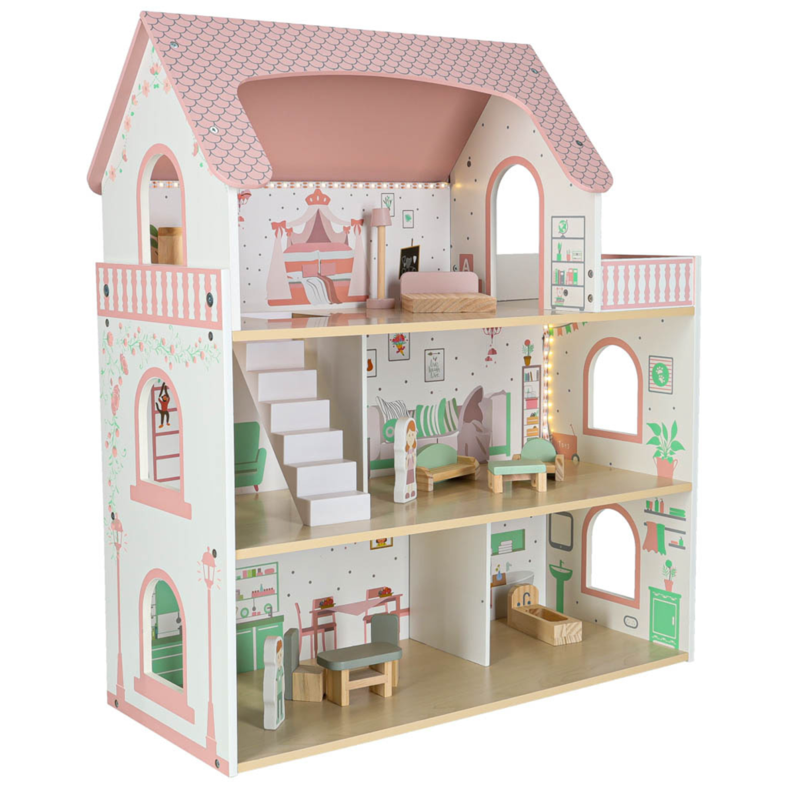 Casa de papusi VarioShop® 70 cm din lemn cu LED si balcon, set complet cu mobilier si figurine, jucarie educativa pentru copii 3+