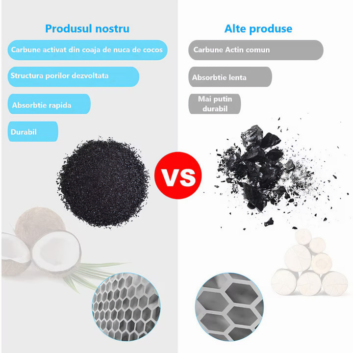- Ingrediente de Filtrare: Bumbac, carbune activ, rasina schimbatoare de ioni
