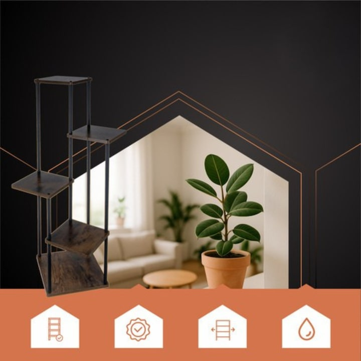 Suport vertical pentru flori si plante VarioShop®, 5 niveluri stil loft industrial, cadru metalic negru cu rafturi MDF culoare lemn, stabil si rezistent, capacitate 75 kg, pentru interior sau balcon