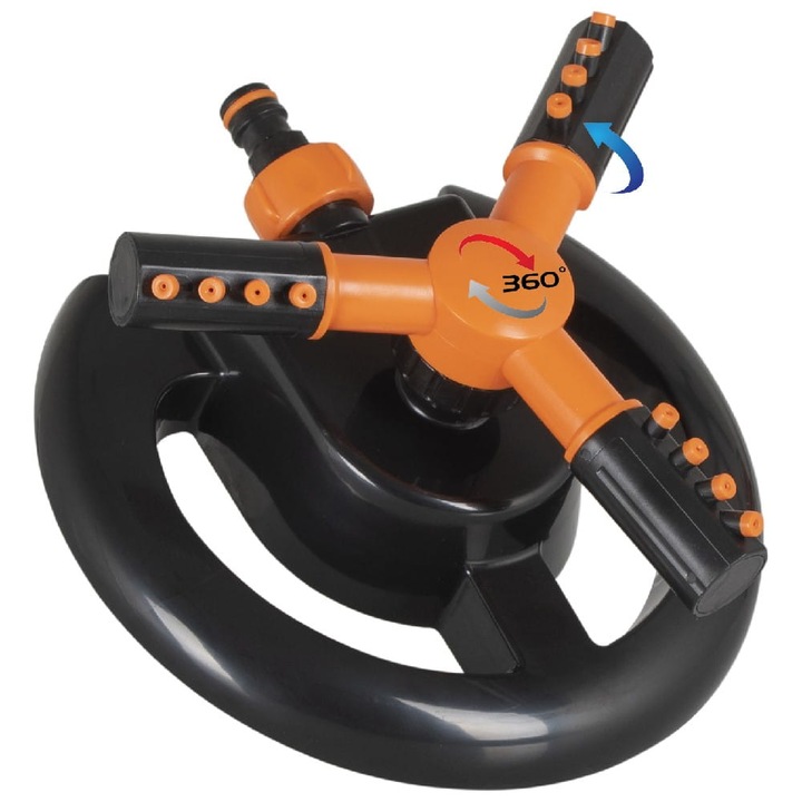 Datorita designului rotativ cu 3 brate reglabile si a celor 12 duze inclinate la unghiuri diferite, aspersorul asigura o udare uniforma, chiar si in colturile greu accesibile sau pe terenuri neregulate. Poti ajusta unghiul de pulverizare intre 10° si 360°, pentru a controla perfect acoperirea.
