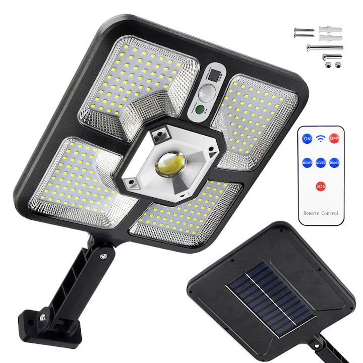 Lampa solara LED VarioShop®, 220 SMD + 15 COB cu senzor de miscare si telecomanda, 4 moduri iluminare, IP 65, panou solar, pentru gradina, curte, alee, Negru