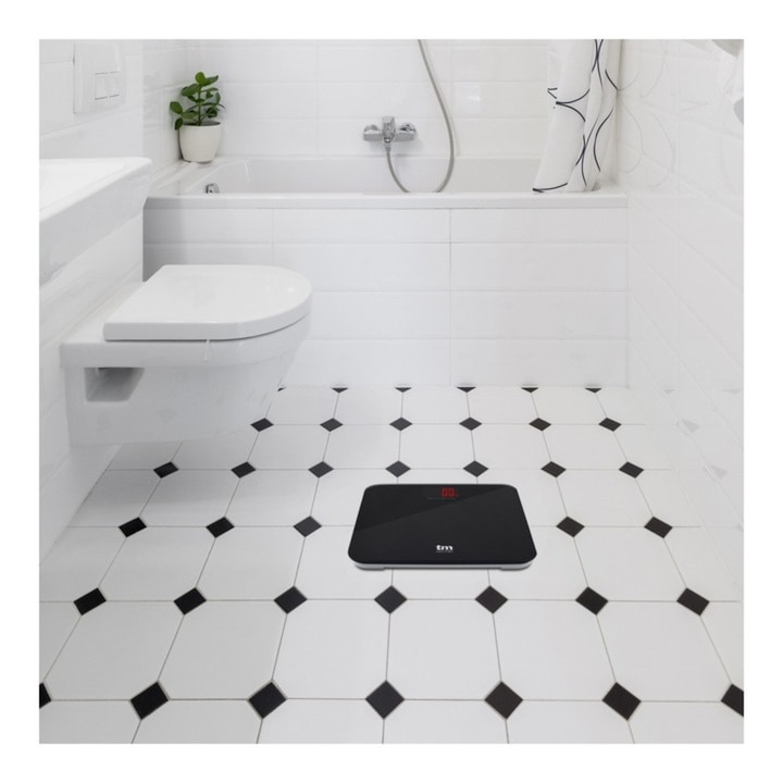 Cantar electronic de baie cu display LCD VarioShop®, din sticla securizata, functie SMART, conectare prin aplicatie, capacitate 180 kg, design modern, 28 x 28 x 2.5 cm, Negru