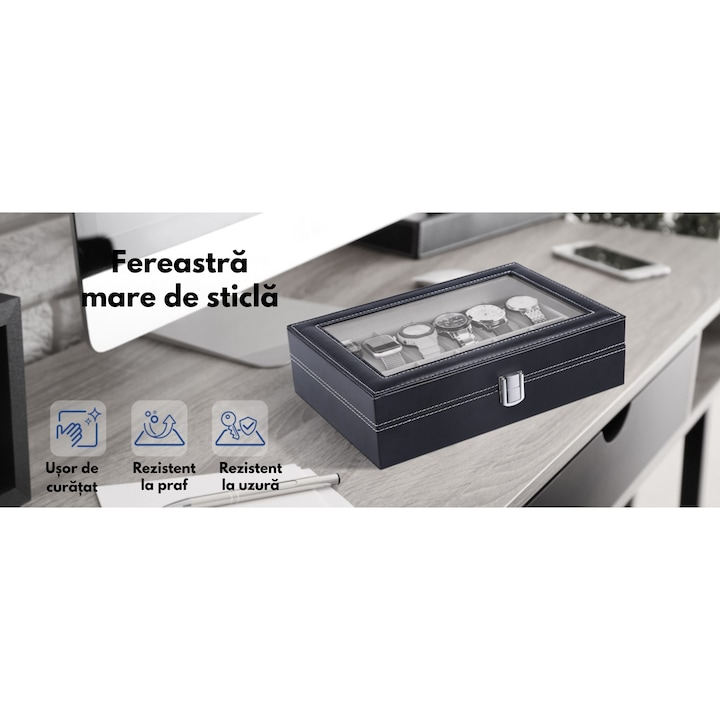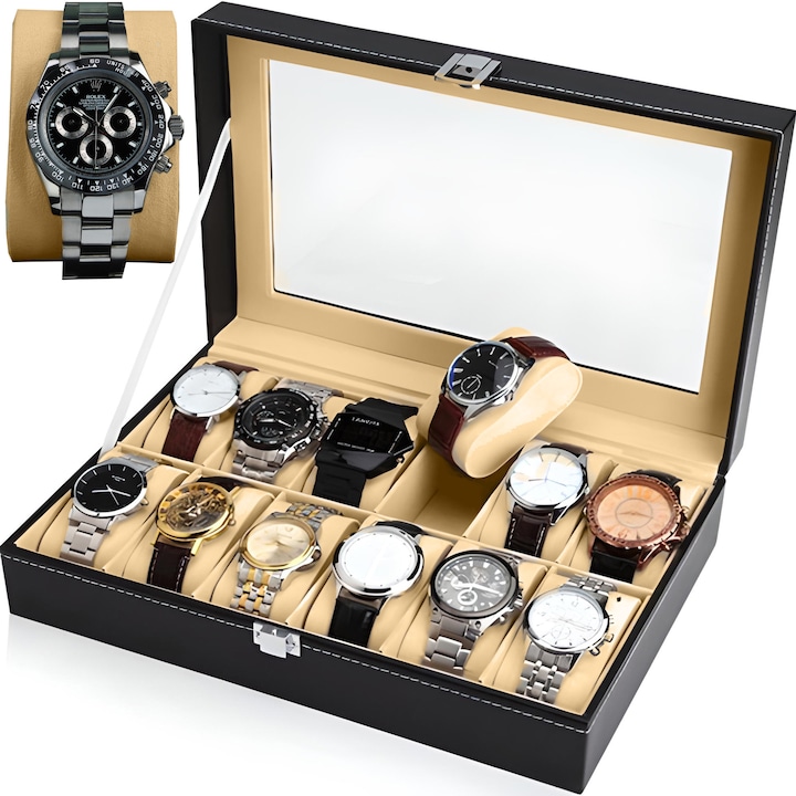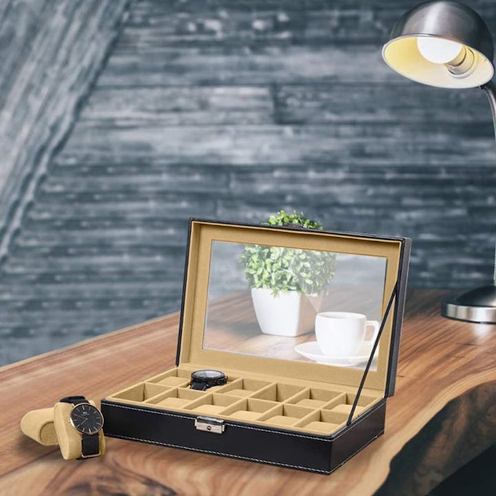 Cutie organizatoare pentru 12 ceasuri VarioShop®, bratari si bijuterii, piele ecologica, capac transparent, inchidere magnetica