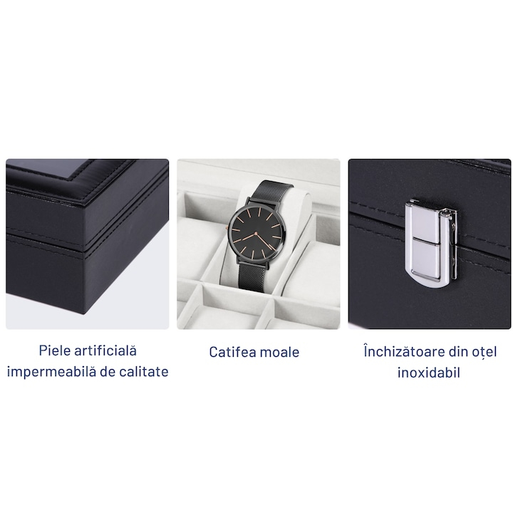 Aceasta cutie organizatoare pentru 12 ceasuri si bijuterii este mai mult decat un simplu loc de depozitare – este o piesa de eleganta si rafinament care iti pune in valoare colectia si iti ofera ordine si siguranta zi de zi.