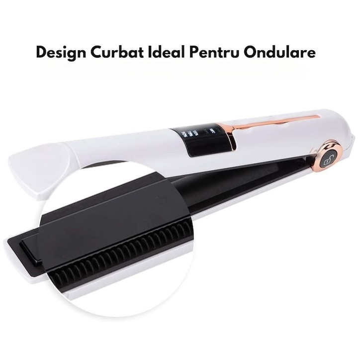Placa de indreptat parul ceramica 2 in 1 cu afisaj LCD, baterie externa si reglaj temperatura, fara fir, portabila, pentru coafuri elegante si onduleuri perfecte, Alb
