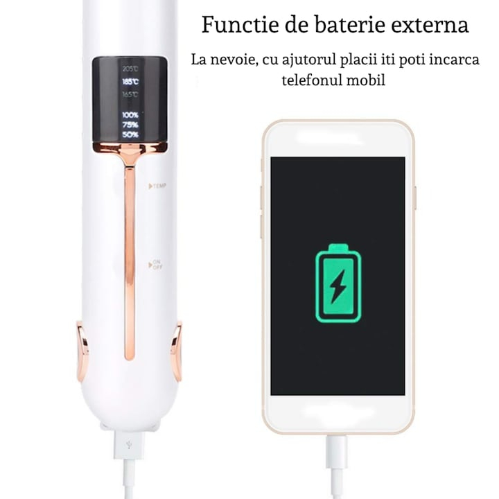 Placa este echipata cu o baterie reincarcabila de 800 mAh, care ofera libertatea de a coafa fara cabluri incomode. Incarcarea se face rapid prin USB-C, iar dispozitivul poate fi folosit si ca powerbank pentru telefonul mobil, oferindu-ti un plus de confort in deplasari.