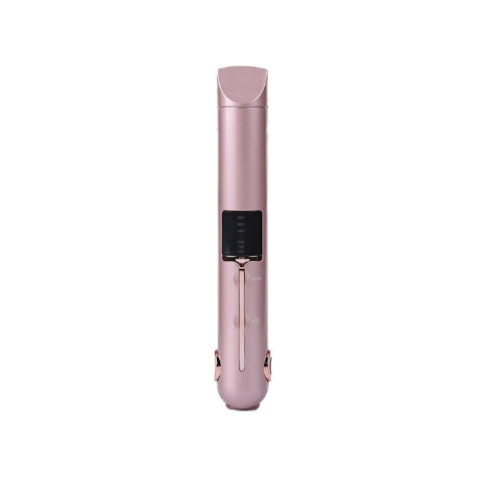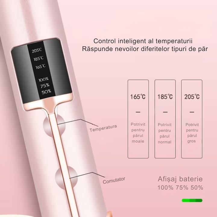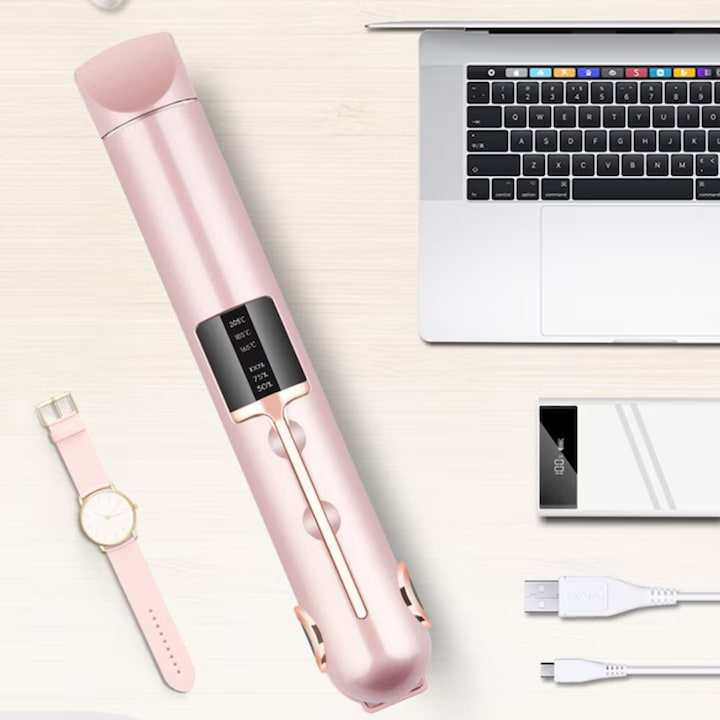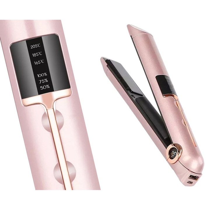 Placa de indreptat parul ceramica 2 in 1 cu afisaj LCD, baterie externa si reglaj temperatura, fara fir, portabila, pentru coafuri elegante si onduleuri perfecte, Roz