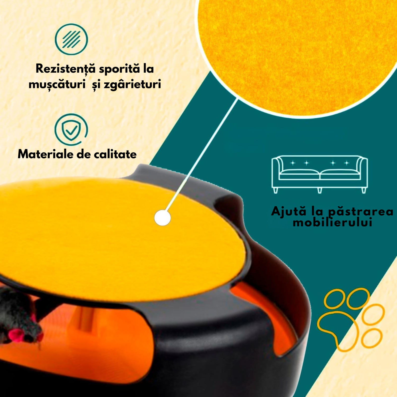 Pe partea superioară a jucăriei există un covoraș din fetru care permite pisicii să-și ascuțească ghearele, protejând mobilierul din casa ta și oferindu-i un loc sigur pentru exercițiile naturale de zgâriat.