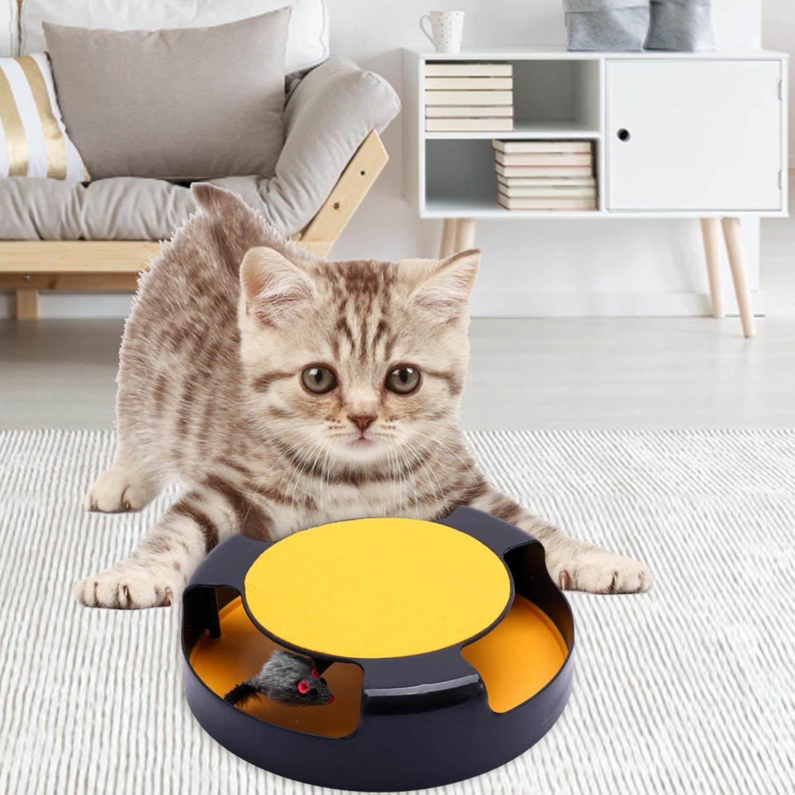 Jucarie Interactiva pentru Pisici – Roata Rotativa cu Soarece din Poliester, Stalp de Zgariat cu Covoras din Fetru, Tapete Antiderapante, Material Durabil PP, 25x6,5 cm