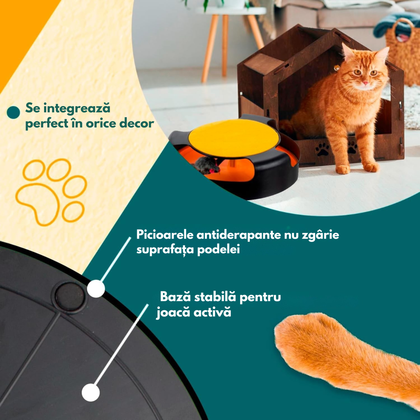 Jucăria are tampoane rotunde antiderapante pe partea inferioară, care împiedică alunecarea sau mișcarea acesteia în timpul jocului. Astfel, podeaua ta rămâne protejată și pisica se poate juca fără incidente.