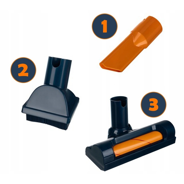 • Accesorii diverse: Include 3 duze interschimbabile – o perie electrica cu cap mobil, o duza pentru crapaturi si o perie pentru tapiterie – toate gandite sa simuleze perfect functiile unui aspirator real.