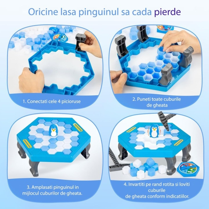 Regulile sunt intuitive si usor de inteles chiar si pentru copiii mai mici: scopul jocului este de a bate cuburile de gheata cu ciocanelele, fara a lasa pinguinul sa cada. Este o provocare amuzanta si captivanta, care starneste rasete si incurajeaza spiritul de competitie prietenos.