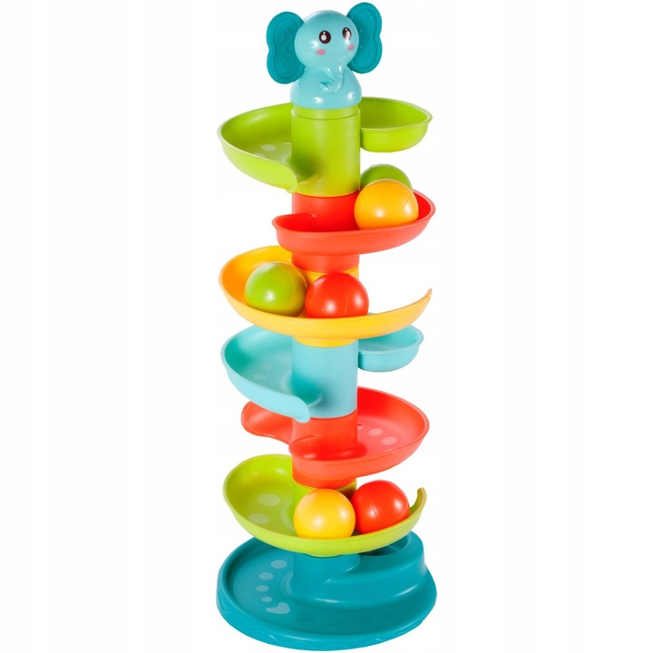 Turn cu bile pentru bebelusi, 48x16.5 cm, cu 6 bile colorate, pista spirala, jucarie educativa senzoriala 18+ luni, dezvoltare motrica si coordonare, usor de asamblat, motiv elefant, multicolor