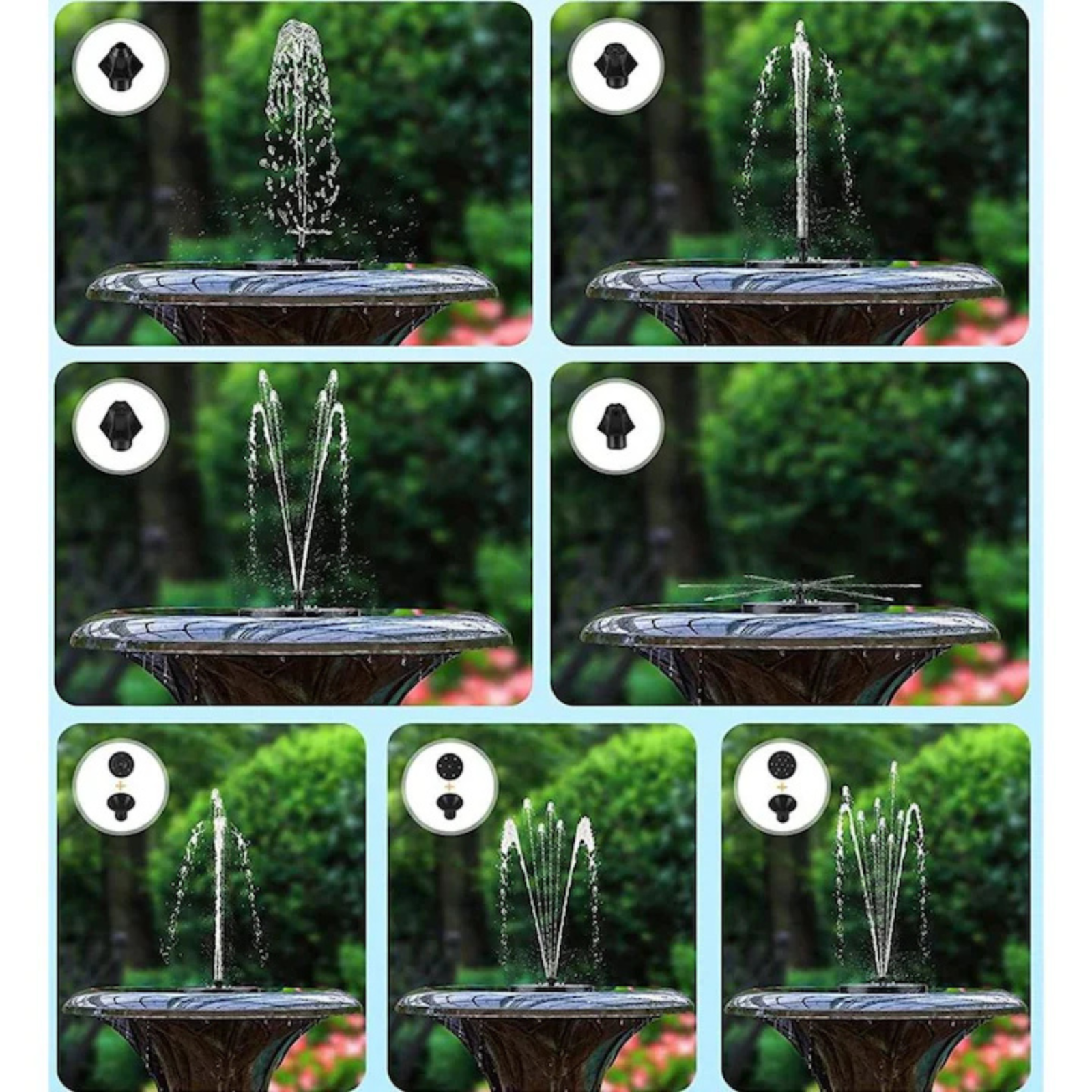 Fantana solara plutitoare pentru gradina VarioShop®, cu 7 capete interschimbabile, lumina LED RGB, 2 moduri de functionare, panou solar 3W, baterie 900mAh, debit 180L/h, inaltime jet pana la 60cm