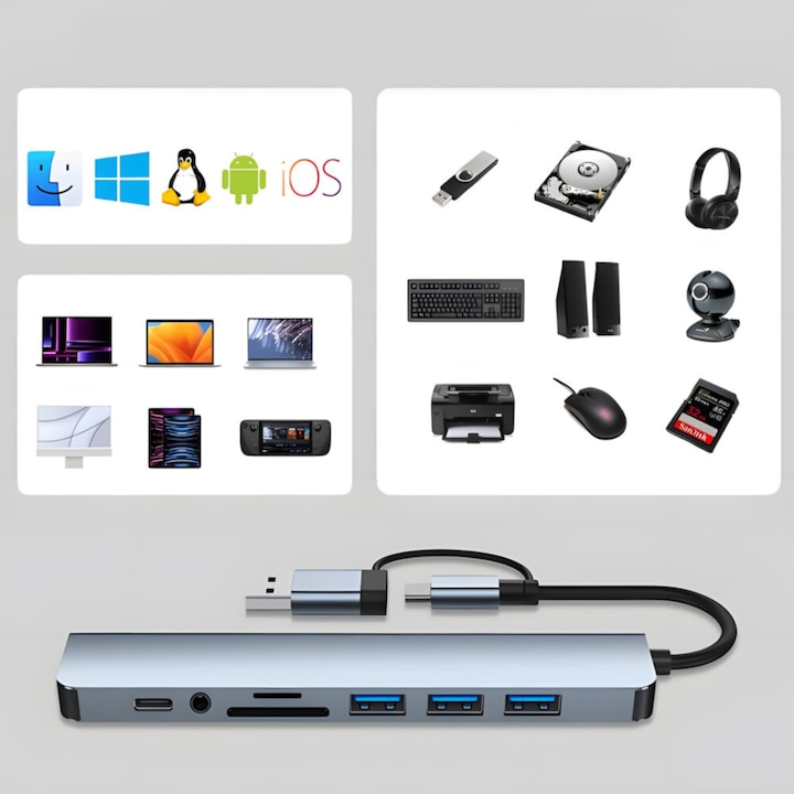 Adaptor Hub USB-C 8 in 1 VarioShop®, din aluminiu, 4x USB 3.0, sloturi microSD/SD, AUX, Power Delivery, Plug & Play, suport 4K, compatibil Windows, Mac, Android, iPad Pro