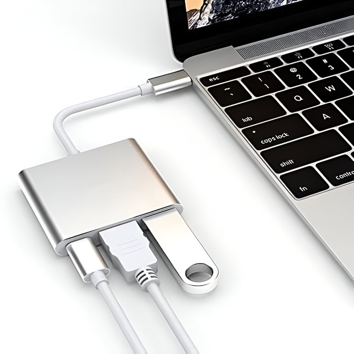 VarioShop® Adaptor Multiport 3 in 1 VarioShop®, USB-C, USB 3.1, HDMI 4K, Plug&Play, 10 Gbps, Hub pentru Laptop, MacBook, Chromebook, Tableta, Portabil, din Aluminiu, Cablu 13 cm, Gri