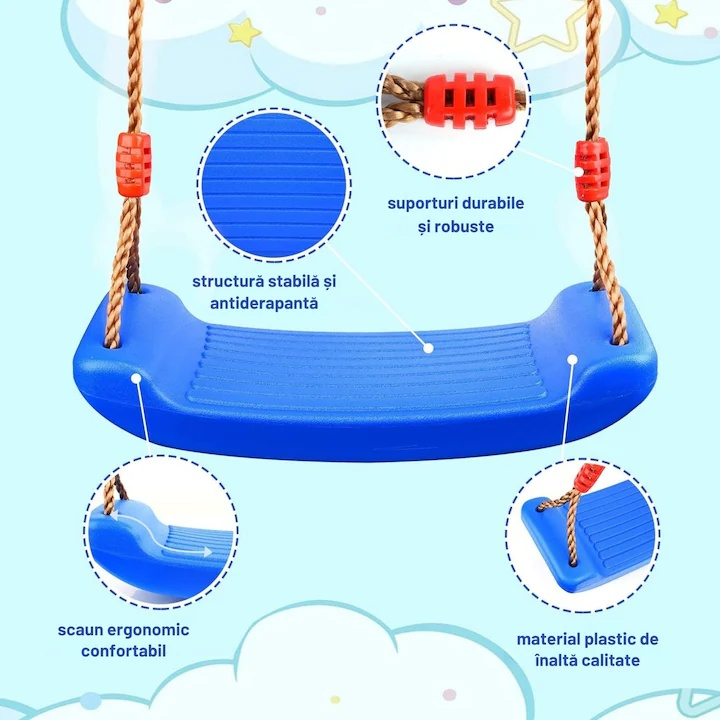 Cand vine vorba de joaca celor mici, siguranta este prioritara! Acest leagan respecta standarde europene stricte, ceea ce inseamna ca poate fi folosit fara griji de catre copii cu o greutate de pana la 50 kg. Constructia solida cu scaun profilat, franghii puternice si elemente de montare metalice asigura stabilitate si reduc riscul de accidentare.