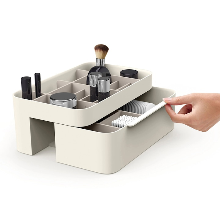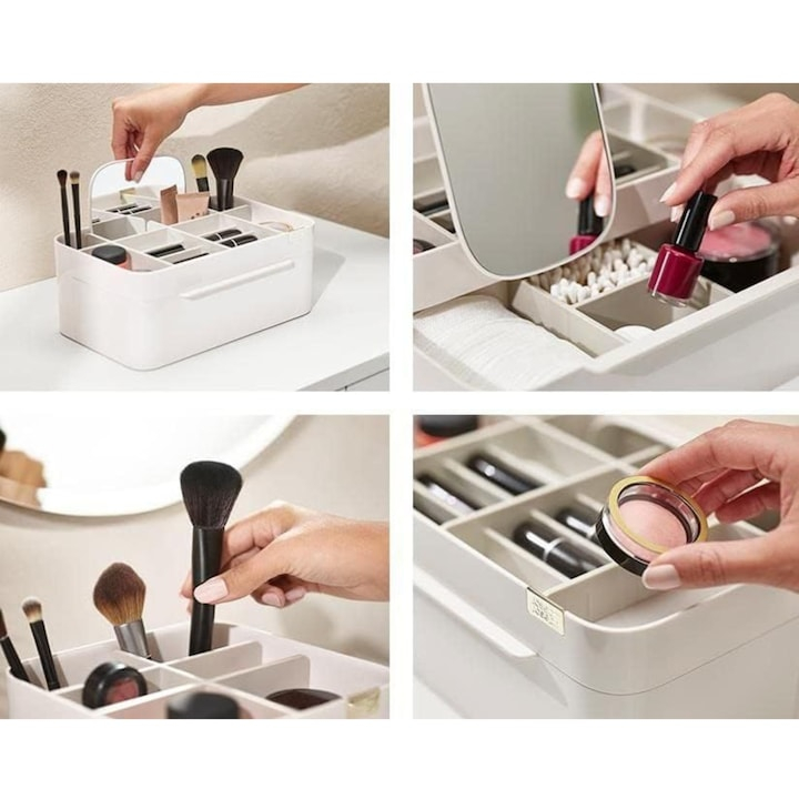 Structura inteligenta a organizatorului include 10 compartimente de diverse dimensiuni, dintre care 4 sunt mai adanci, potrivite pentru produse mai inalte precum fondul de ten, lotiuni sau parfumuri. Un sertar spatios completeaza designul, ideal pentru pastrarea discreta a obiectelor mai mici sau mai sensibile. Compartimentele sunt detasabile, permitandu-ti sa reorganizezi spatiul in functie de propriile nevoi si tipul produselor folosite.