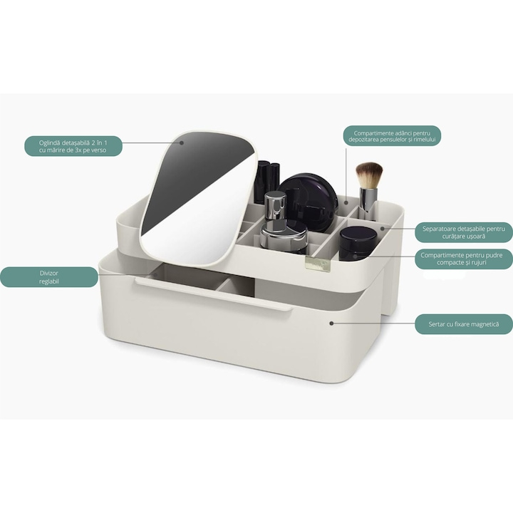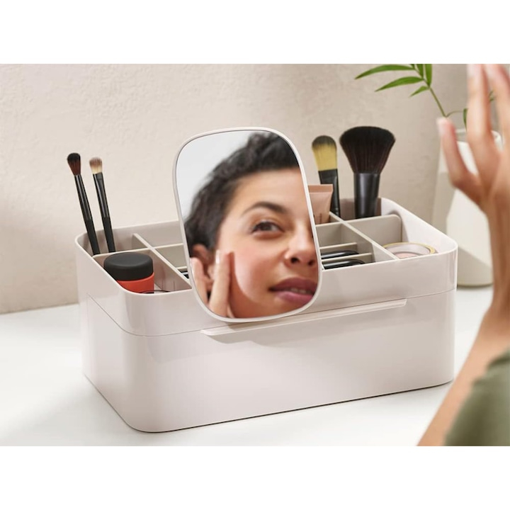 Vedeta acestui organizator este oglinda cu doua fete: o parte cu reflexie normala si cealalta cu marire tripla – perfecta pentru detalii fine precum aplicarea eyelinerului sau pensarea sprancenelor. Oglinda poate fi atasata oriunde pe organizator datorita unui sistem de prindere ingenios, care asigura stabilitate si flexibilitate maxima.
