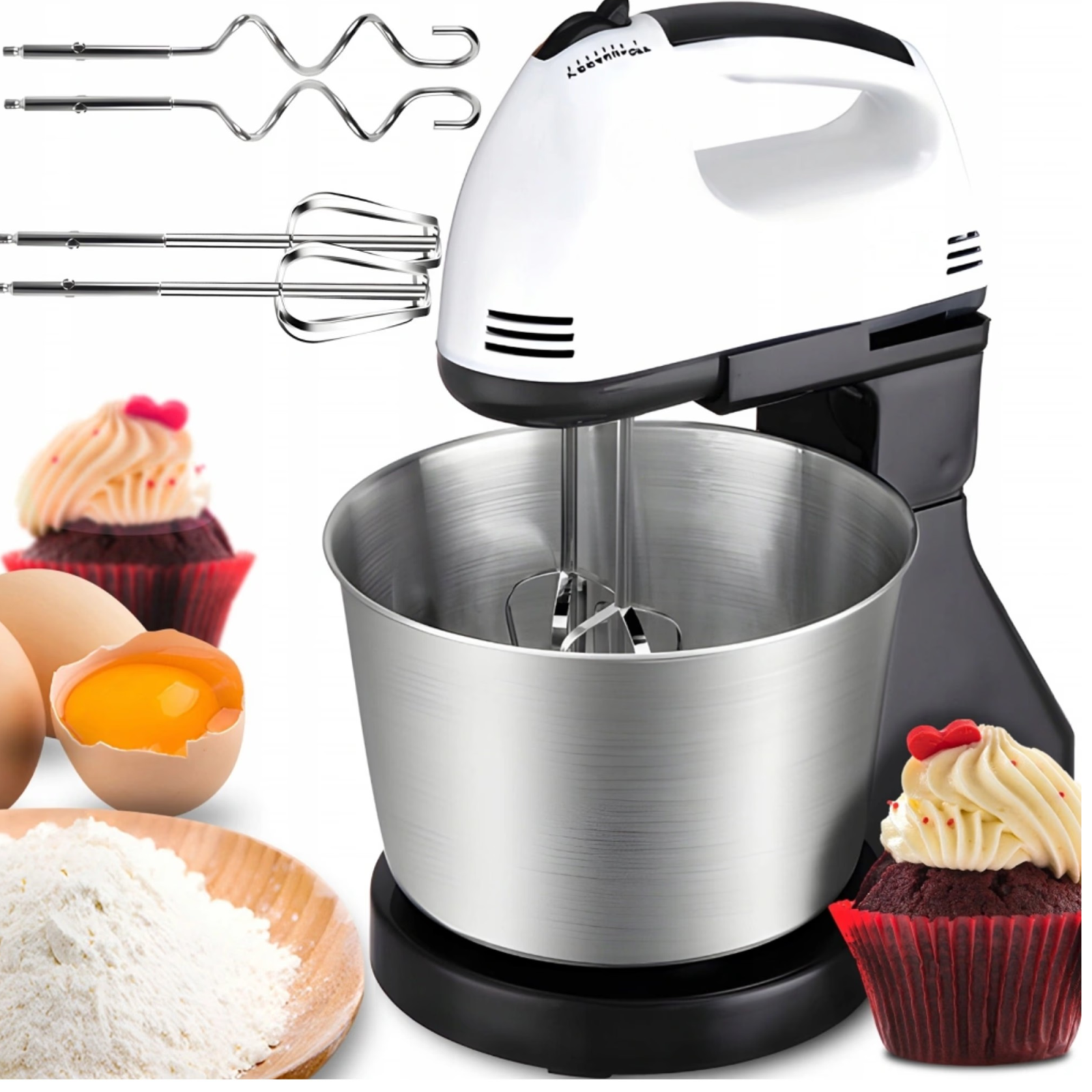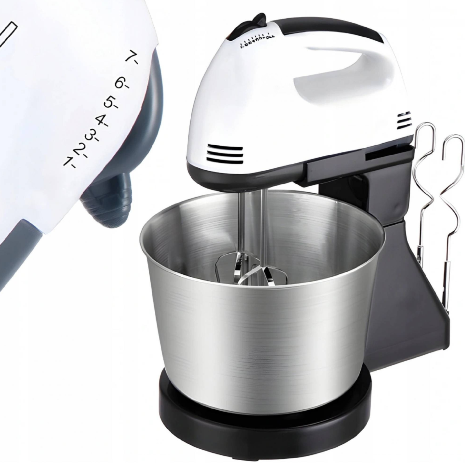 Acest mixer multifunctional este dotat cu 4 accesorii utile: doua teluri pentru batut oua si creme, si doua carlige pentru framantarea aluatului.