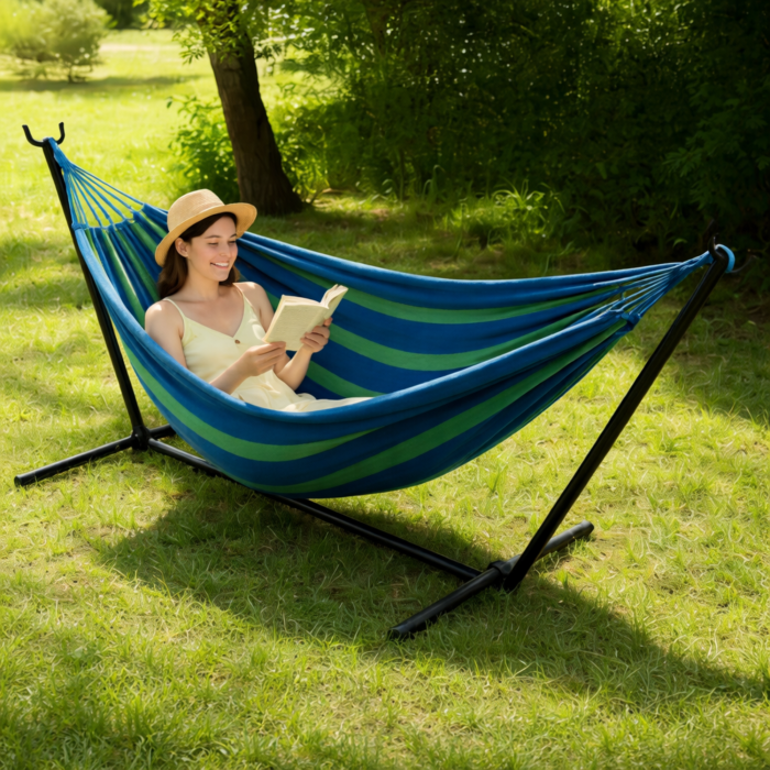 Bucura-te de momente reale de relaxare cu acest hamac cu suport metalic inclus, conceput pentru confort maxim si durabilitate pe termen lung. Ideal pentru gradina, terasa, balcon sau chiar interior, acest set complet iti ofera libertatea de a te relaxa oriunde, fara a avea nevoie de copaci sau sisteme suplimentare de prindere.