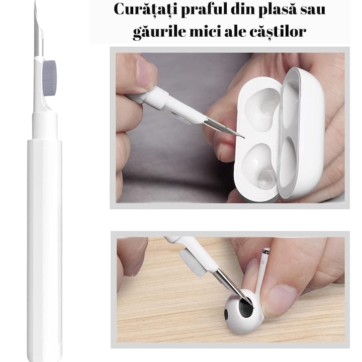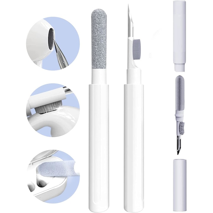 Kit de curatare pentru casti si telefon 3 in 1 VarioShop®, multifunctional, design ergonomic, compact, versatil, 10 x 7.5 cm, Alb