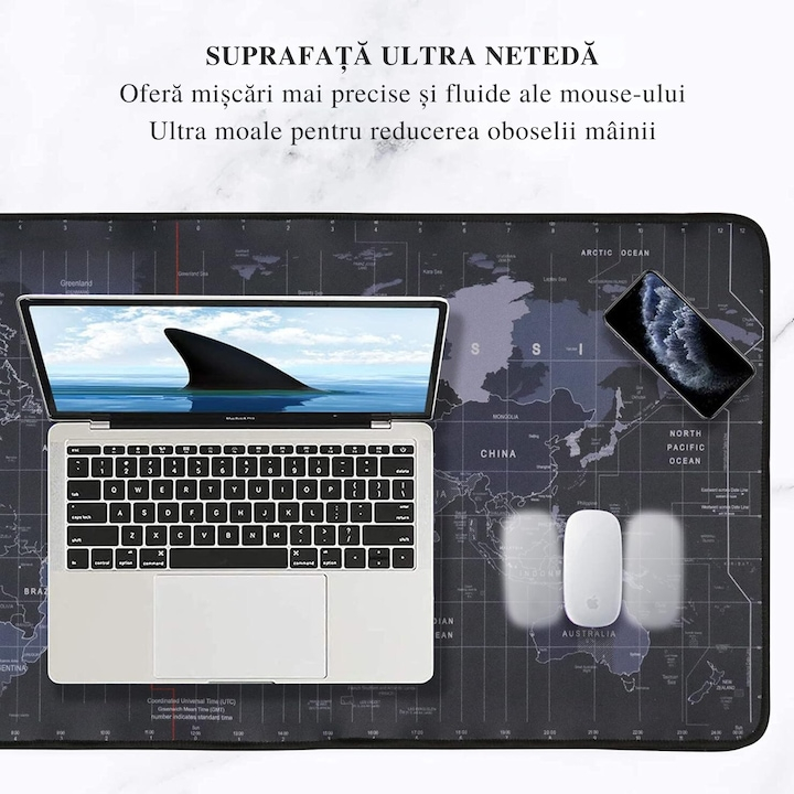 Pe langa aspectul sau tehnic, padul este dotat cu un imprimeu atragator cu harta lumii. Acest detaliu nu doar ca imbunatateste estetic spatiul tau de lucru, ci ii ofera si o nota educativa, fiind ideal pentru a stimula curiozitatea copiilor in privinta geografiei. Padul se integreaza perfect in orice decor, aducand un plus de stil biroului tau.