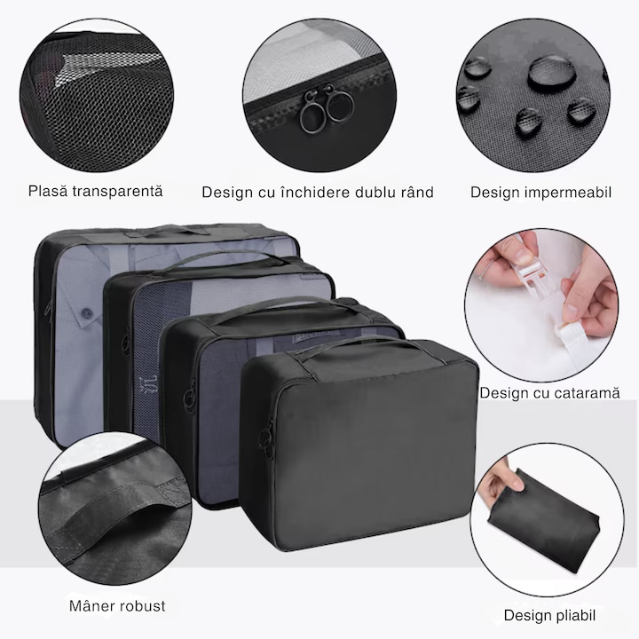 Transforma-ti modul in care impachetezi si organizezi lucrurile cu acest set de organizatoare de calatorie 8 in 1. Conceput inteligent pentru a maximiza spatiul si a pastra totul in ordine, setul este ideal pentru excursii, city break-uri, vacante sau organizarea zilnica in camera sau camin.
