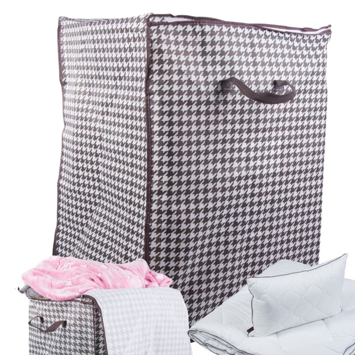 Organizator textil pliabil VarioShop®, pentru haine, lenjerii si paturi, capacitate 180L, material respirabil, cu fermoar dublu si manere laterale, Alb/Negru