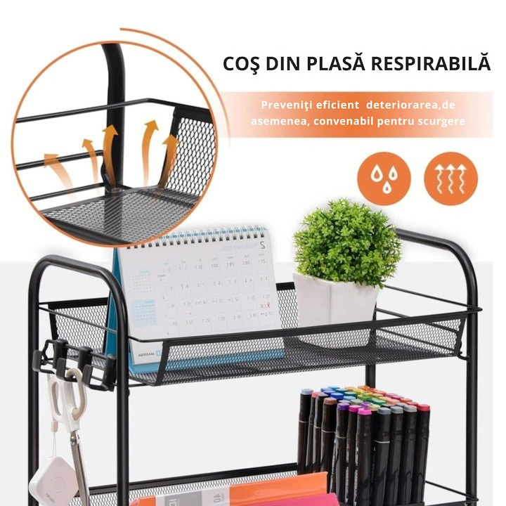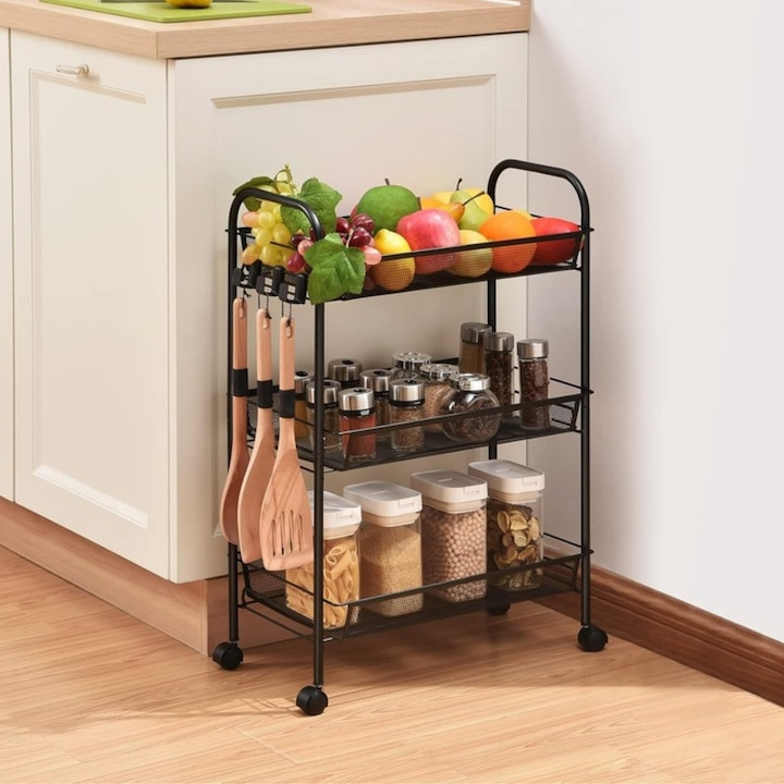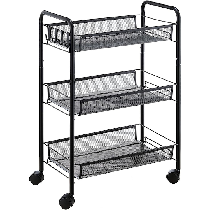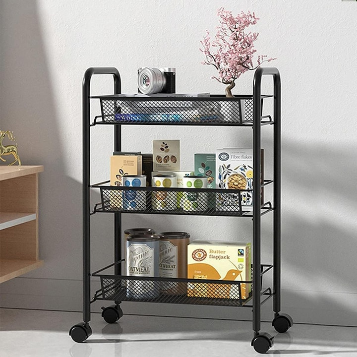 Fie ca ai nevoie de mai mult spatiu de depozitare in baie, bucatarie, birou sau chiar dormitor, acest raft este solutia ideala. Cele trei rafturi metalice incapatoare iti permit sa pastrezi la indemana obiectele esentiale, iar datorita designului sau compact, poate fi utilizat chiar si in cele mai inguste colturi ale casei.